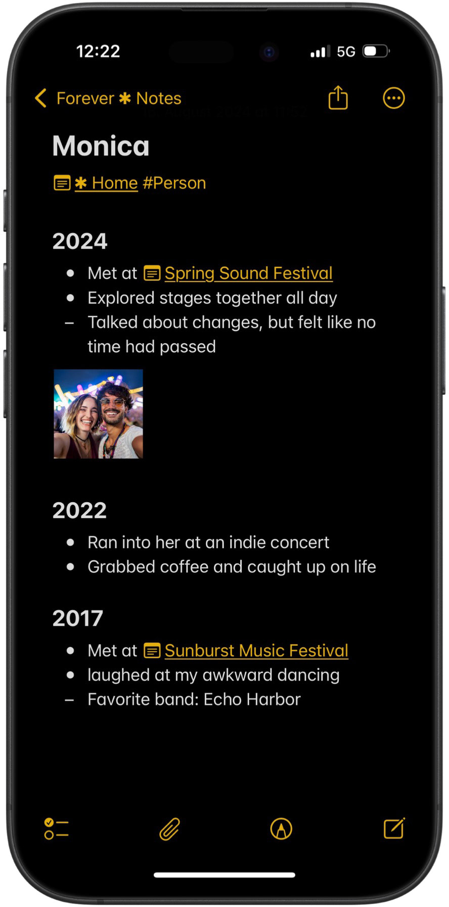 Knowledge links: These connect related topics on the same level of hierarchy. For instance, on the note about your friend Monica you can create a link to the note about the Spring Sound Festival which you organized and where you met. This allows you to connect Monica’s details directly to festival-related information.